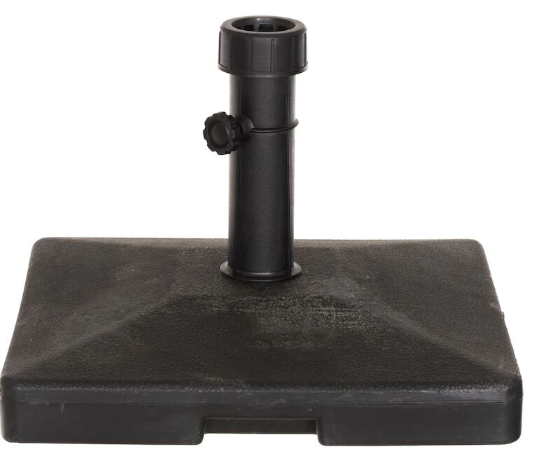 Aurinkovarjon jalka 27 kg neliön muotoinen. Musta betonista ja polyresiinista valmistettu aurinkovarjon jalka, joka pitää varjon paikallaan. Tähän jalkaan sopii halkaisijaltaan 30/35/38 mm varsi.