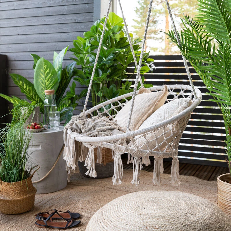 Rentoon oleskeluun soveltuva 4Living riipputuoli. Riipputuolin runkomateriaalina on teräs ja istuinosa on 100% puuvillaa. Kudottu punos ja hapsut tuovat tuoliin boheemia ilmettä. Riipputuolin voi sijoittaa ulos katettuihin tiloihin ja se soveltuu mainiosti toki myös sisällä käytettäväksi. Kattokiinnikkeet eivät sisälly pakkaukseen.