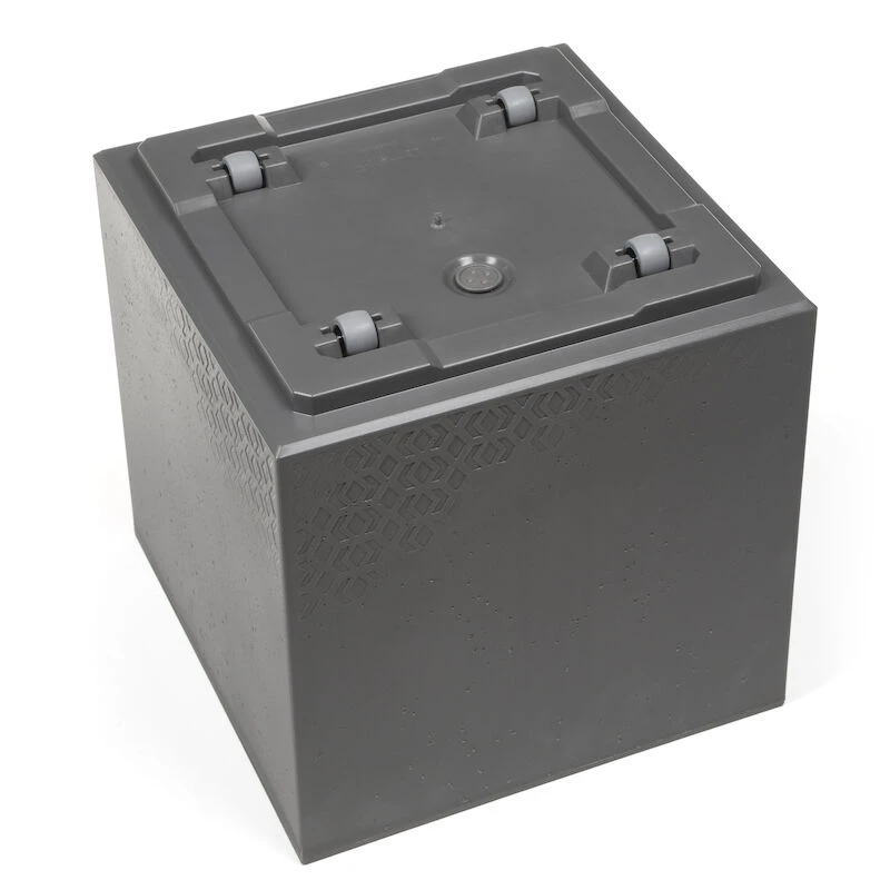 Sisä- ja ulkokäyttöön soveltuva UV-suojattu ruukku on valmistettu kestävästä 100 % kierrätysmuovista, mutta näyttää aidolta betoniruukulta. Ruukun pohjassa on pyörät, jotka helpottavat siirtelyä. Pohjassa myös tyhjennysventtiili.