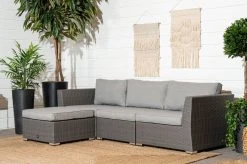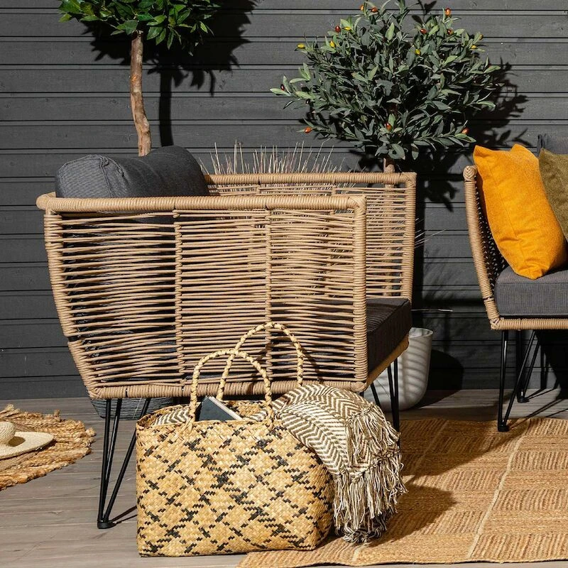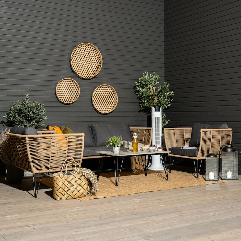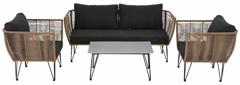 Kepeä ja linjakas Bloomingville Mundo sohvaryhmä on tarkoitettu kodin ulkotiloihin. Ryhmä koostuu 3-istuttavasta sohvasta, kahdesta nojatuolista ja sohvapöydästä. Jalat on mustaksi maalattua terästä ja punos muovia. Pehmusteiden kangasmateriaalina on 100 % polyester. Kankaassa on kaunis ja hyvin skandinaavinen tekstuuri. Säänkestävät materiaalit, joten on käyttökelpoinen pitkälle syksyyn. Pöydän kansi on betonia, eli pöytä on hyvin tukeva kahvihetkiä ajatellen. Istuin- ja selkätyynyjen päälliset ovat irroitettavissa vetoketjun avulla, sekä pestävissä 30 asteen konepesulla.