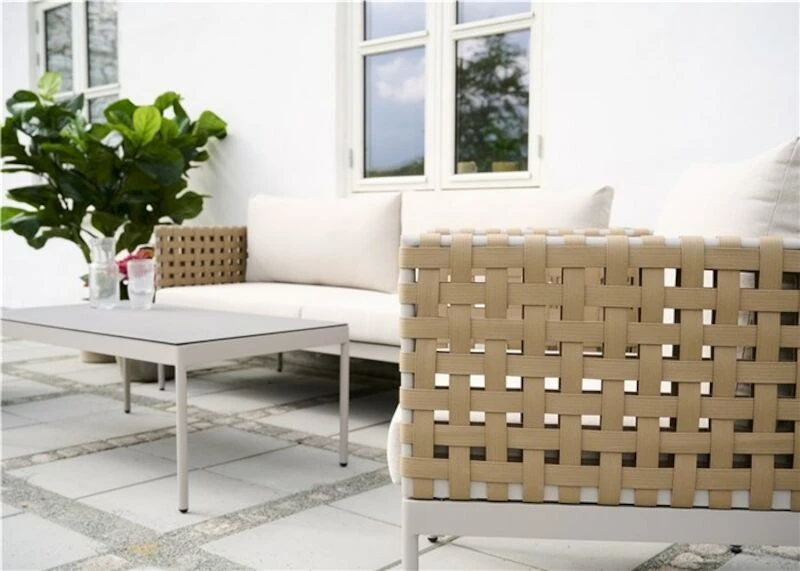 Tyylikäs Envy Dicte sohvaryhmä sisältää kaksi nojatuolia, sirokokoisen sohvan sekä sohvapöydän. Sohvapöydässä on spraystone-kansi, joka on sekoitus jauhettua luonnonkiveä ja korkealaatuista hartsia ruiskutettuna lasilevylle. Lasikannen pinta näyttää siis kiveltä. Sohvaryhmän vaaleus ja maanläheiset sävyt luovat harmonisen kokonaisuuden. Tyylikkäänä yksityiskohtana sohvassa toimii polyrottinkiset, punotut käsinojat. Sohvaryhmän runko on kestävää ja kevyttä alumiinia. Pehmusteiden päälliset ovat kehrättyä polyesteriä. Pehmusteet on suositeltavaa suojata sateelta.
