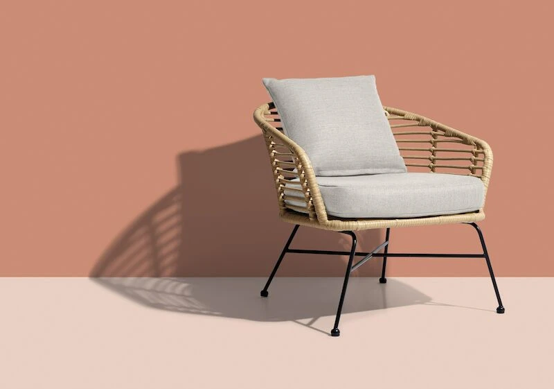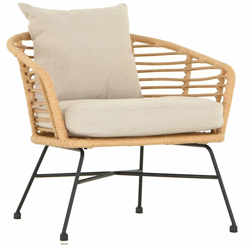 Tyylikäs ja moderni Envy Kaja nojatuoli sopii hyvin Skandinaaviseen sisustukseen. Kaunis vaalea polyrottinki istuinosa ja mustaksi maalatut jalat. Istuintyynyjen paksuus 5 cm. Polyrottinki on helppohoitoinen materiaali, joka kestää hyvin ulkona. Kevyen ja ilmavan näköinen nojatuoli on tukeva ja helposti siirreltävissä. Yhdistämällä saman sarjan sohvaan, saat näyttävän kokonaisuuden. Istuin pehmusteiden päällinen 100% Polyesteria ja pesu 30°.