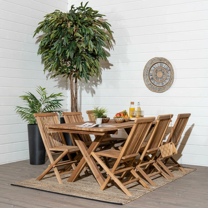 Kaunis tiikkinen kuuden hengen ruokailuryhmä ulkotiloihin. Tuolit on kasaan taitettavia, joten niitä on helppo tarvittaessa liikutella ja ne vie säilytyksessä vähemmän tilaa. Ruokailuryhmän sävy on kauniin kullanruskea, joka tuo ulkotilojen sisustukseen kodikasta ja lämmintä tunnelmaa.