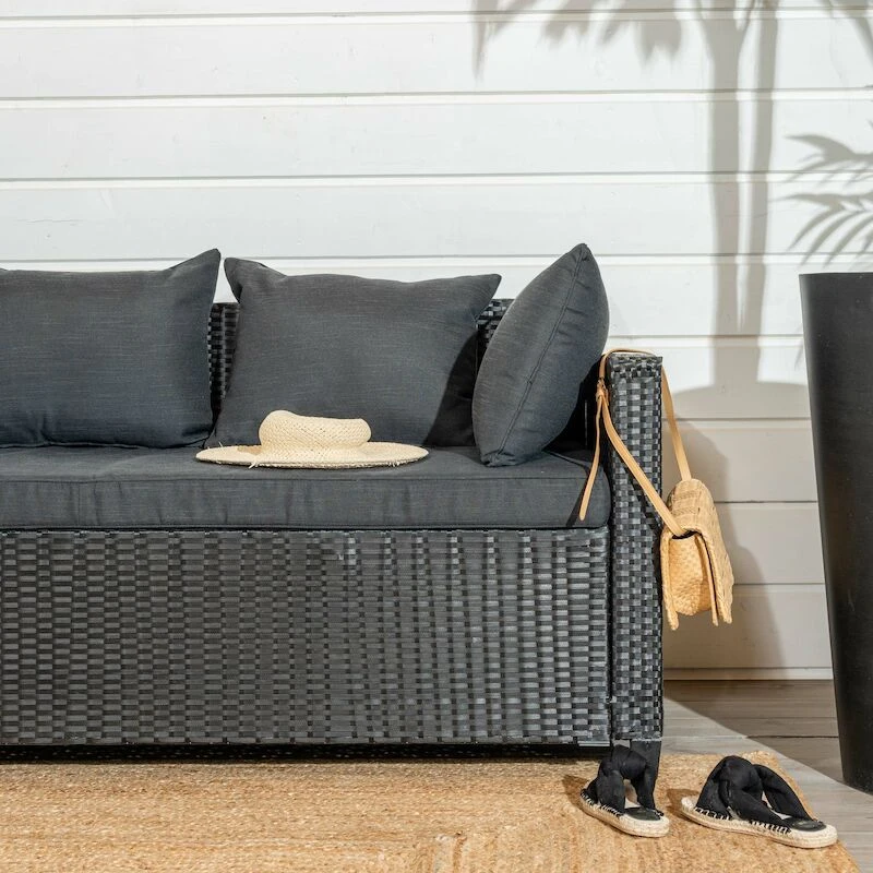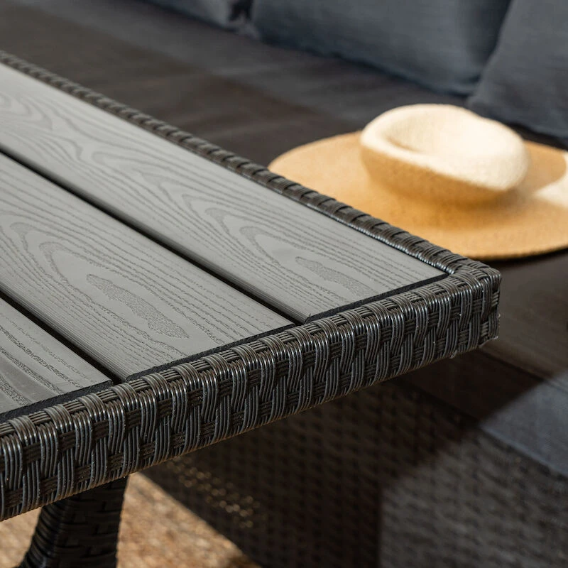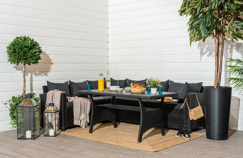 Aapa kulmasohva on täydellinen kesäillan viettoon tuttavien ja perheen kanssa. Siinä on mukava ottaa päivällä nokoset ja illan hämärtyessä kääriytyä vilttiin nauttimaan lämpimästä kesäillasta. Tuote on tukeva ja helppo pitää puhtaana. Rungossa on mustaksi pulverimaalattu teräsrunko ja pöydän kansi on aintwoodia eli puukomposiittia. Ryhmään kuuluu harmaat pehmusteet, jotka ovat irroitettavissa ja pestävissä. Verhoilu on 100% polyesteriä ja tyyny vaahtomuovia missä on seassa polyesterikuituja. Kätisyyttä voi vaihtaa.