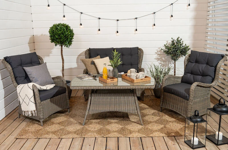 Aura sohvaryhmässä on kahden hengen sohva ja kaksi nojatuolia. Selkänojissa on poikkeuksellisen paljon korkeutta, mikä tuo ehdottomasti lisämukavuutta pidempäänkin oleskeluun. Alumiinirunko, jonka päällä pyöreää ja puolipyöreää pajua. Harmaat tyynyt ovat 100% polyesteriä, täytteenä 230gr vanu.