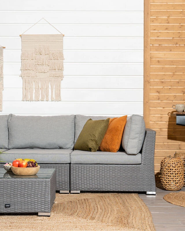 Iso ja todella tyylikäs kulmasohva 2K3 koostuu moduuleista, jotka kiinnitetään toisiinsa kätevillä kiinnikkeillä. Kätisyys on helposti vaihdettavissa moduulien paikkoja vaihtamalla. Moduulien paikkoja voi vapaasti vaihdella, joten tuotteesta on mahdollisuus rakentaa myös erinäköisiä kokonaisuuksia. Sohvassa on muhkeat pehmusteet, joiden päälliset on irroitettavissa ja pestävissä. Kangas on laadukas ja vettä hylkivä. Iso kulmasohva tuo runsaasti istumatilaa ja siinä mahtuu hyvin myös makoilemaan. Ostamalla lisää moduuleja saat laajennettua tuotetta helposti. Hinta ei sisällä .