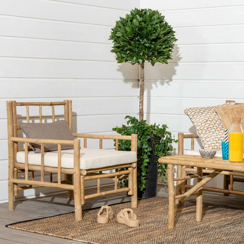 Helle sohvaryhmä on kaunis bambuinen oleskeluryhmä niin terassille kuin parvekkeellekin. Helle ryhmään kuuluu 3-istuttava sohva, kaksi nojatuolia ja penkki, joka ryhmässä soljuu mukana sohvapöytänä. Helle ryhmää sopii käyttää myös esim. ihanilla lasikuisteilla! Runko on pintakäsitelty lakalla. Bambu on kaunis luonnonmateriaali, jonka vuoksi jokainen tuote on ainutlaatuinen ja väri voikin hieman vaihdella. Pehmusteen päälliset voi irrottaa ja pestä käsin haalealla vedellä. Kangas on 70% puuvillaa ja 30% polyesteriä. Istuinpehmuste on vaahtomuovia.