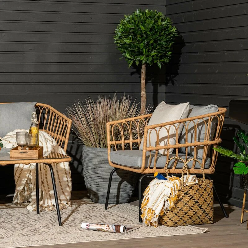 Iisa sohvaryhmä on kaunis yhdistelmä upeasti punottua polyrottinkia ja maalattua metallia. Pöydän kansi on lasia. Ihanat pehmusteet tuovat lisämukavuutta oleskeluun. Pehmusteiden päälliset ovat 100% polyesteriä. Hanki lisäksi sohvaryhmälle torkkupeittoja ja voit nauttia illoista pitkään. Sohvan istuinleveys 120 cm ja nojatuolin 49 cm.
