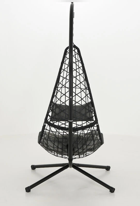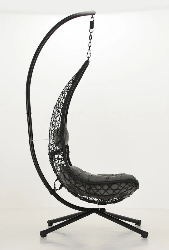 Ilmava ja siro Ilta -riipputuoli rentoon istumiseen. Runko on maalattua terästä, keinuosa UV-suojattua polyrottinkia, pehmustemateriaali kosteutta hylkivää polyesterikangasta.