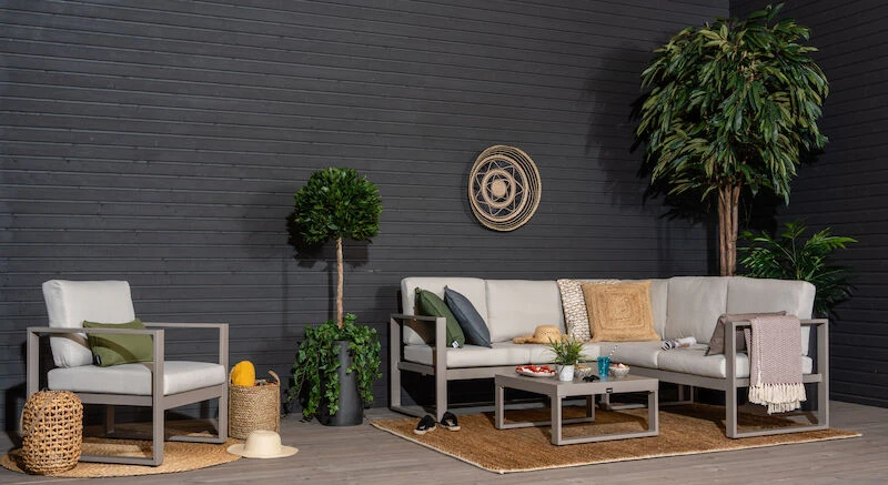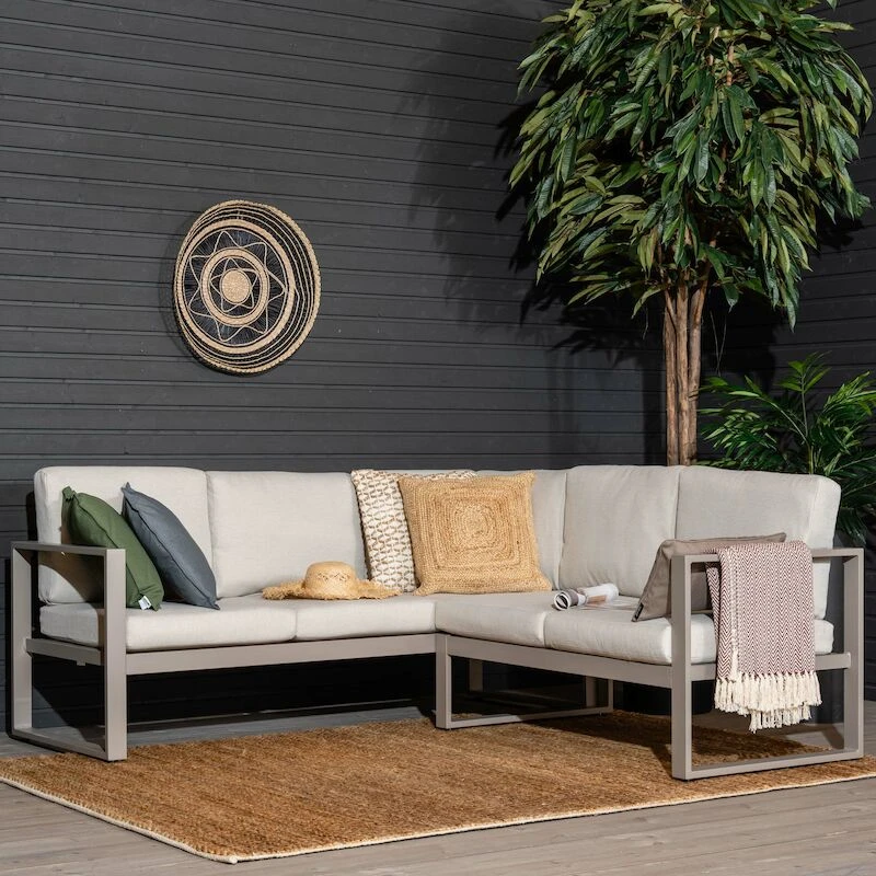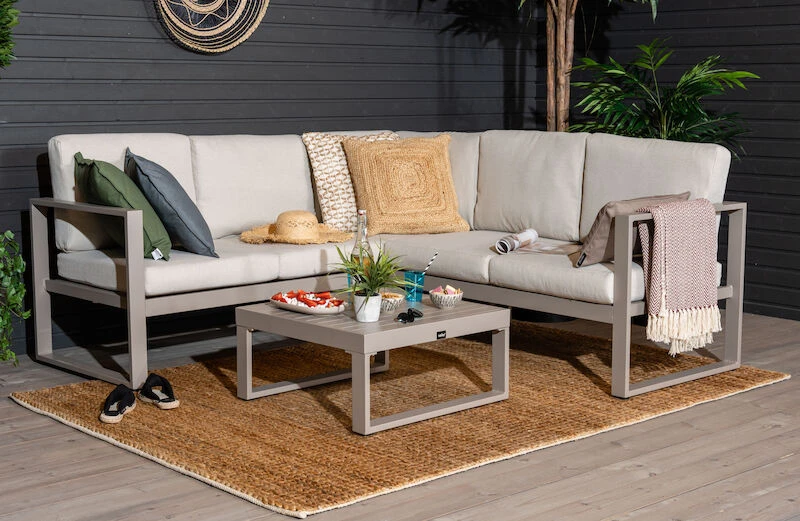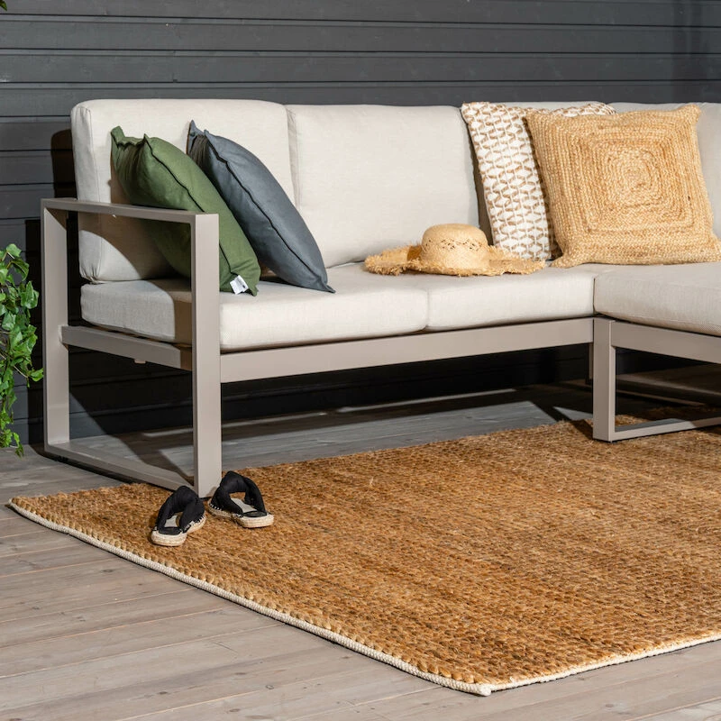 Kallas kulmasohva on täydellinen valinta terassille, patiolle tai parvekkeelle. Tämä tyylikäs kulmasohva on suunniteltu ulkokäyttöön ja sen runko on valmistettu laadukkaasta jauhemaalatusta alumiinista, joka kestää hyvin sään vaihteluita. Sisältää muhkeat hiekan väriset istuin- ja selkäpehmusteet, joiden päälliset on irroitettavissa ja pestävissä. Pehmusteiden päälliset on verhoiltu kestävällä ulkokäyttöön tarkoitetulla vettähylkivällä polyester kankaalla.