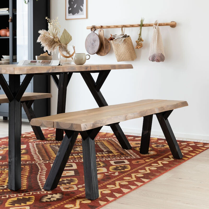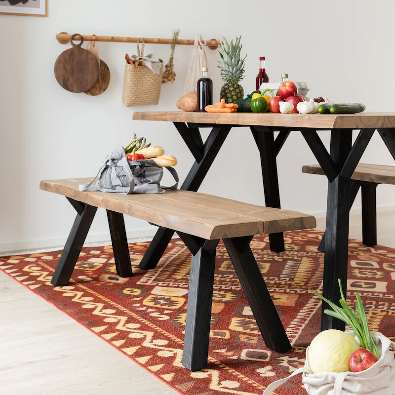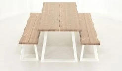 Pöydän ja penkin leveys ei ole joka kohdasta sama, sillä sivut ovat epätasaiset. Tästä johtuen leveysmitta on noin mitta, joka voi vaihdella tuotekohtaisesti.