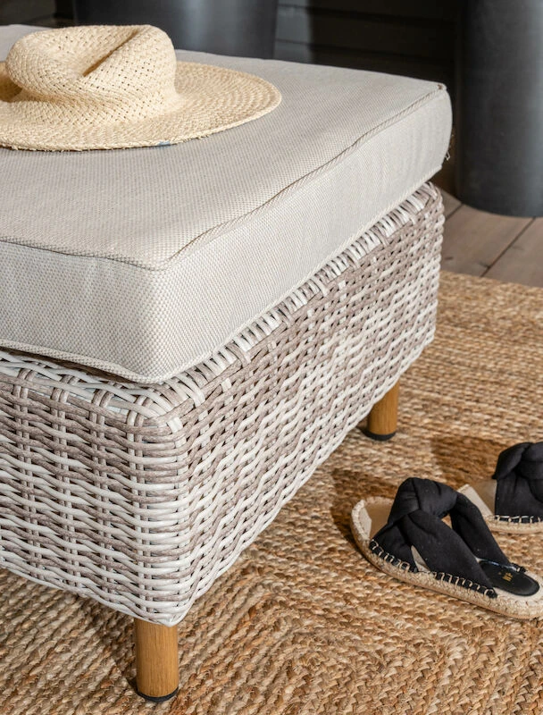 Tahrat poistetaan miedolla saippua- ja vesiliuoksella, kostealla liinalla pyyhkimällä. Suositellaan käytettäväksi ulkokalusteiden puhdistukseen tarkoitettuja puhdistus- ja suoja-aineita. Suojaa pehmusteet jatkuvalta, suoralta auringon valolta. Päälliset: Irroitettavissa ja pestävissä käsin 30 asteessa. Käytä mietoja pesuaineita pesussa. Valkaisu, silitys, rumpukuivaus ja kemiallinen pesu kielletty. Talvisäilytys kuivassa ja ilmavassa tilassa.
