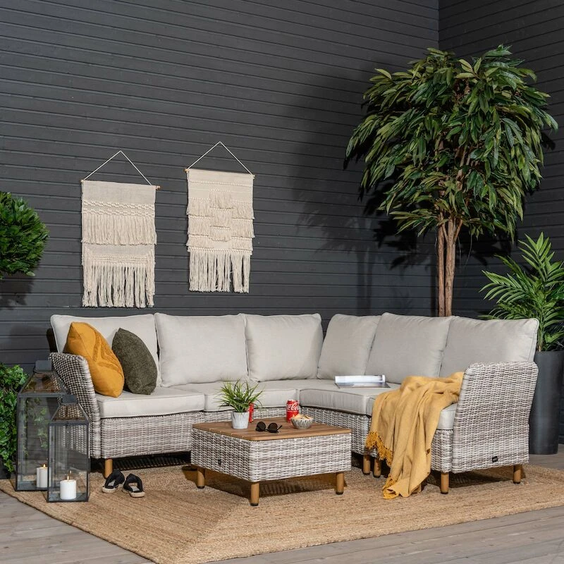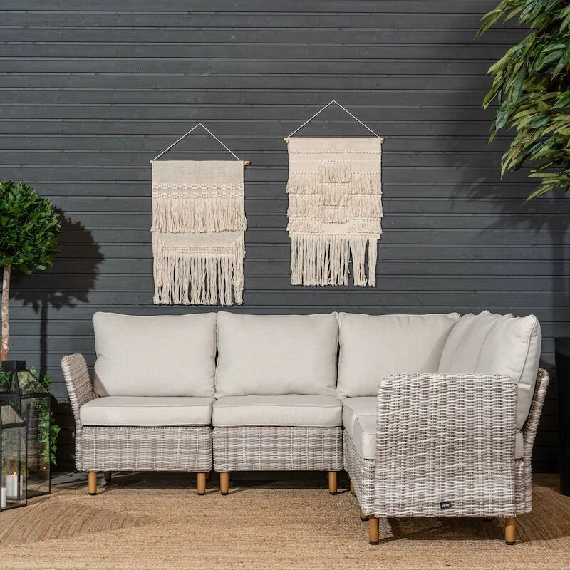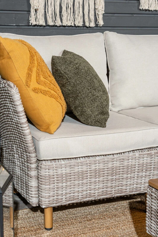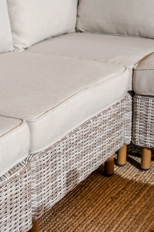 Upea kulmasohva 2K2 koostuu Lehdokki tuotesarjan moduuleista, jotka kiinnitetään toisiinsa helposti kiinnikkeillä. Moduulien paikkoja voi vapaasti vaihdella, joten tuotteesta on mahdollisuus rakentaa myös erinäköisiä kokonaisuuksia. Sohvassa on muhkeat pehmusteet, joiden päälliset on irroitettavissa ja pestävissä. Kangas on laadukas ja vettä hylkivä, mutta sateelta pehmusteet on kuitenkin suositeltavaa suojata. Iso kulmasohva tuo runsaasti oleskelutilaa teressille ja ostamalla lisää moduuleja saat laajennettua tuotetta tarvittaessa lisääkin. Hinta ei sisällä .