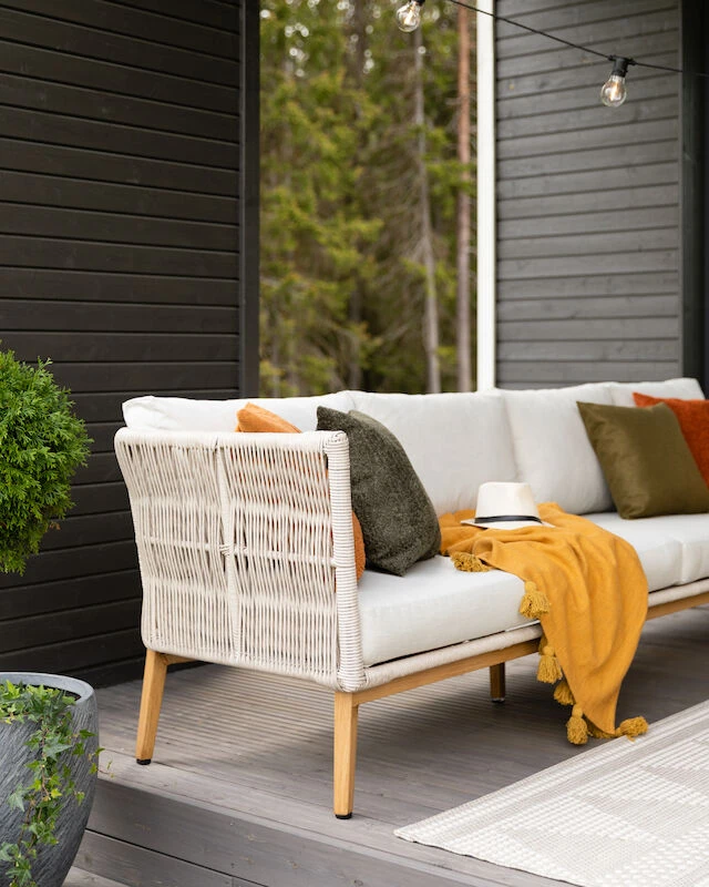 Loiste on kaunis ja selkeälinjainen kulmasohva, jossa on reilusti tilaa istuskella tai pötkötellä. Kulmasohvassa on ruostumaton alumiinirunko, jossa on kaunis maalattu puukuviointi. Mukavuutta ja pehmeyttä sohvaan tuo paksut selkä- ja istuintyynyt. Tyynyjen kangas on hyvin säätä ja uv-säteilyä kestävää materiaalia, mutta ne eivät ole kuitenkaan vedenpitävät. Päälliset ovat irroitettavat.