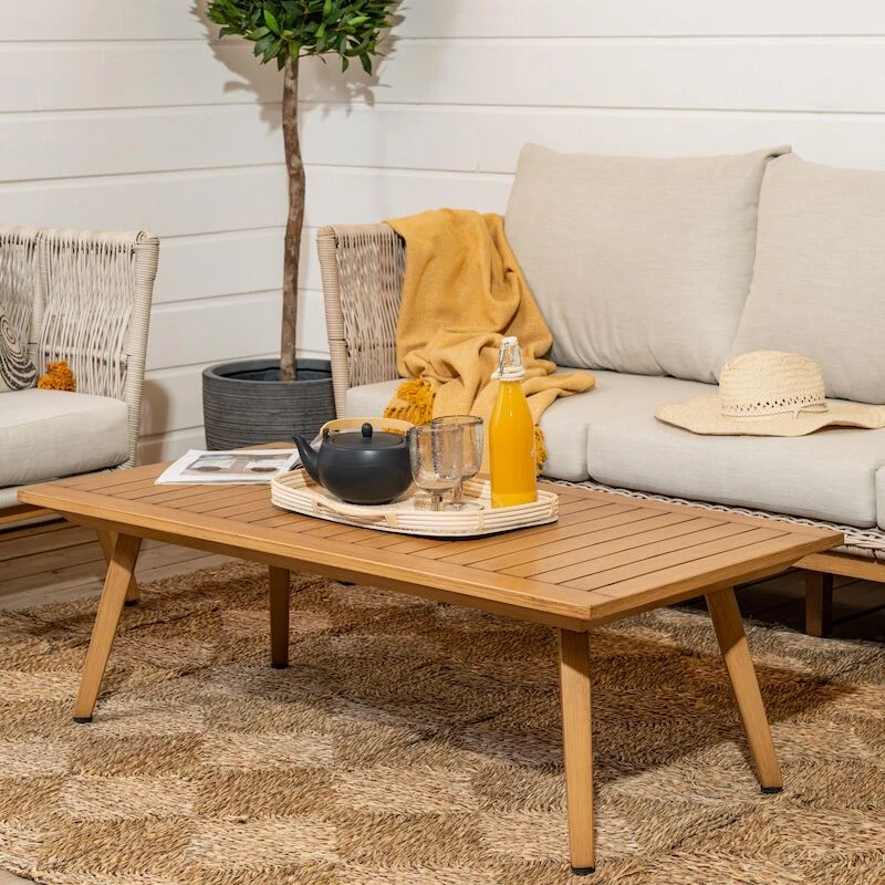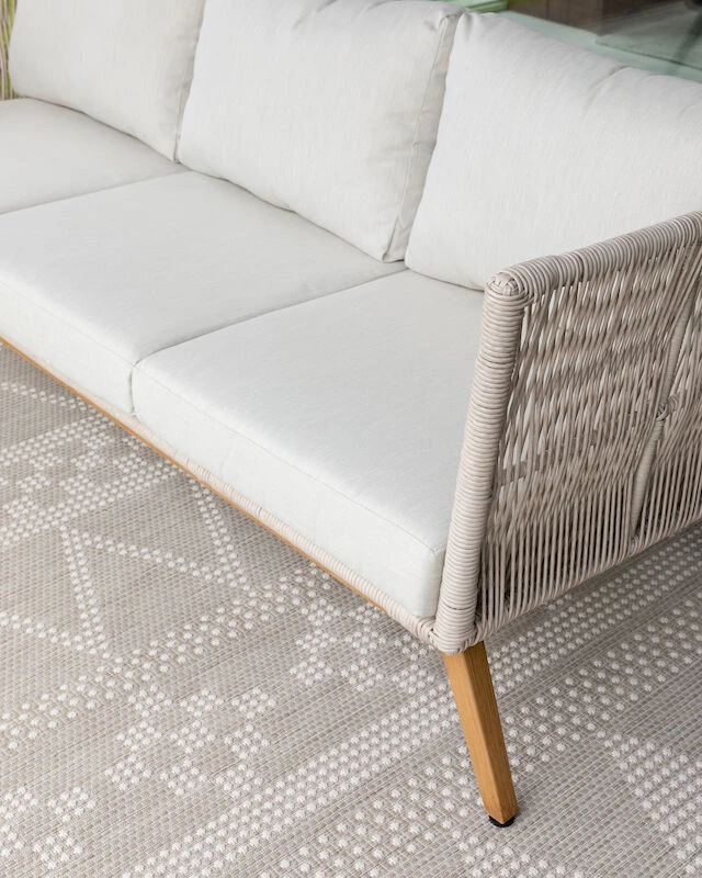 Loiste on todella kaunis hiekan värinen sohvaryhmä, johon kuuluu kaksi polyrottinkista nojatuolia, 3-istuttava sohva sekä sohvapöytä. Sohvan ja nojatuolien tyylikkään ilmeen viimeistelee kestävä alumiininen runko ja jalkaosa, johon on maalattu puukuviota jäljittelevä pinta. Ryhmään kuuluu muhkeat pehmusteet. Pehmusteiden päälliset ovat säänkestävää kangasta ja päälliset ovat irroitettavat. Pehmusteet eivät kuitenkaan ole vedenpitävät, joten ne tulee suojata sateelta.