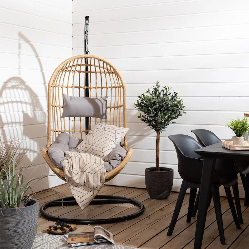 Upeaan Luoto riipputuoliin kuuluu vaaleanharmaat puolipehmeät vedenkestävät pehmusteet sekä jalusta. Istuinkorkeus on säädettävissä välille 40-56cm. Keinuosan korkeus on 128cm, leveys 86cm ja syvyys 84cm. Jalkaosan halkaisija 104cm. Jalkaosa täytyy kasata itse. Tyylikäs ja helppohoitoinen polyrottinkipunos sopii hyvin ulkokäyttöön.