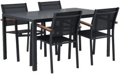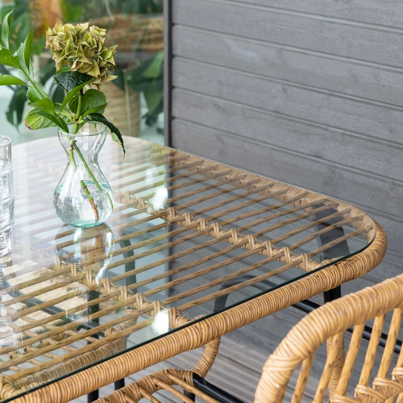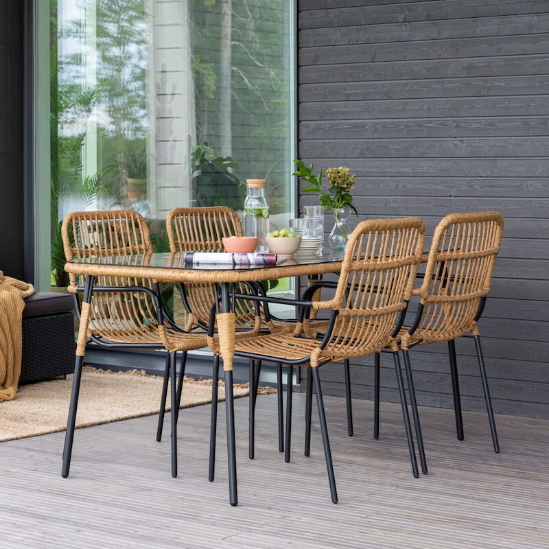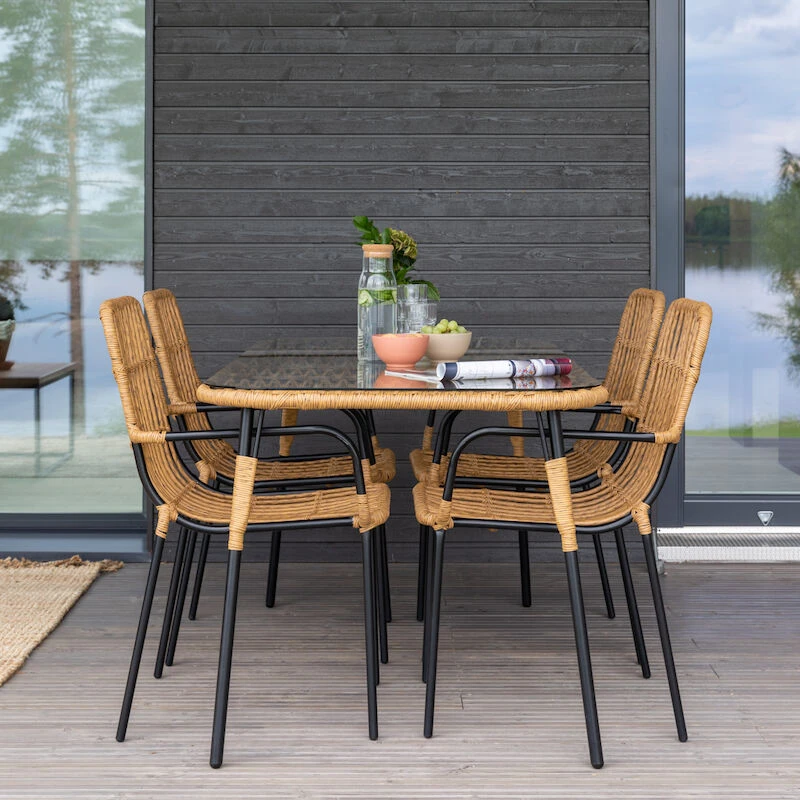 4-hengen Oldie-ruokailuryhmä on valmistettu polyrottingista ja varustettu näyttävillä mustilla metallijaloilla. 5 mm karkaistulla lämpölasilla varustettu pöytä kruunaa tämän sisustuksellisen kokonaisuuden. Sopii erinomaisesti katetulle-/lasitetulle terassille tai parvekkeelle. Tuotetta ei tule jättää suoralle sateelle alttiiksi.
