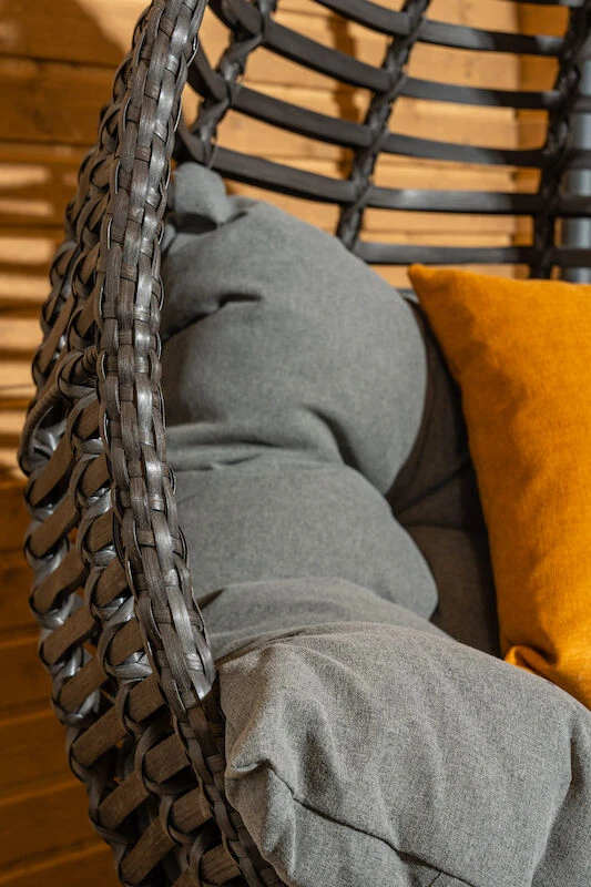 Pisara riippukeinu jalustalla ja muhkealla 20 cm paksulla UV-suojatulla pehmusteella. Pehmusteen päällinen on 100% polyesteriä. Keinun runko, polyrottinkipunokset ja pehmusteet ovat väriltään kauniin harmaat. Pisara riippukeinun jalkaosa toimitetaan kahdessa osassa. Keinuosan mitat: Leveys 104 cm, syvyys 74 cm, korkeus 124 cm, sisäkorkeus 105 cm, joka on mitattu pehmuste paikallaan.