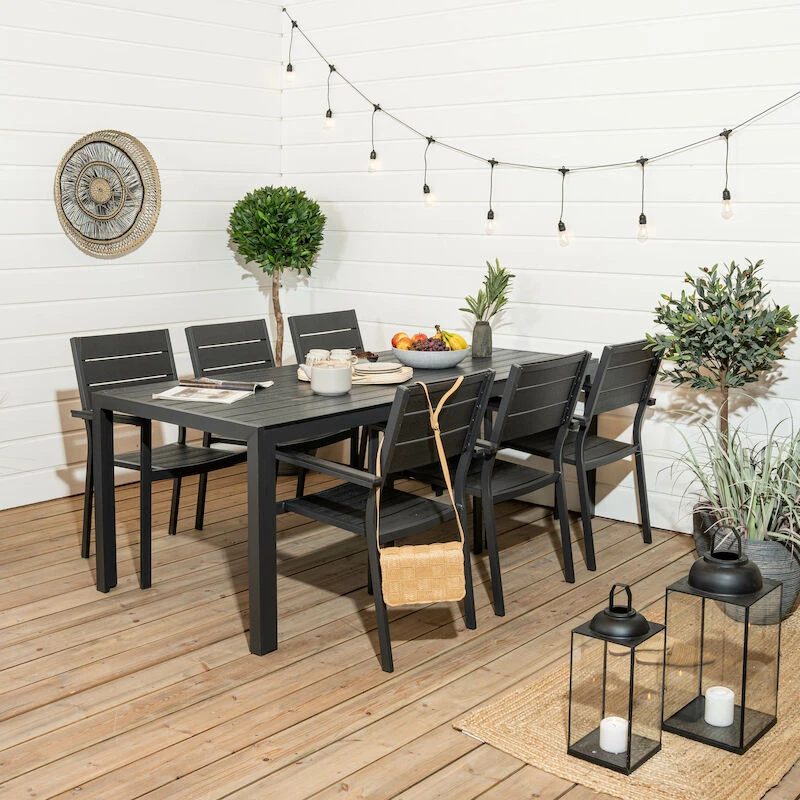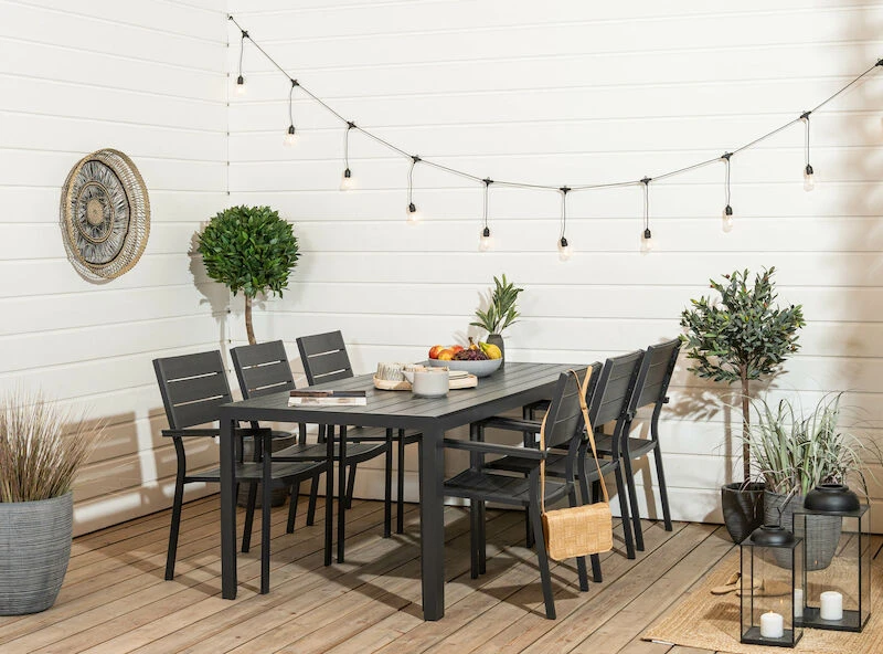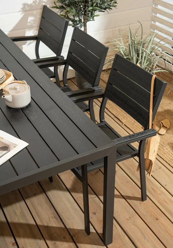 Laadukas ja huoltovapaa Saarni ruokailuryhmä kuudelle hengelle. Pöydän ja tuolien rungot ovat alumiinia, joka ei ruostu. Pöydän kansi, tuolien istuin- ja selkäosa, sekä käsinojien päälliset ovat aintwood puukomposiittia, joka on huoltovapaa, helppohoitoinen ja säänkestävä. Aintwood on kovaa puristettua muovia (polystyrene), johon on tehty aidon puun kauneus. Tuolit ovat pinottavissa päällekkäin, joten ne eivät vie paljoa tilaa säilytyksessä. Tuolit toimitetaan valmiiksi kasattuina ja pöytä jalat irrallaan.