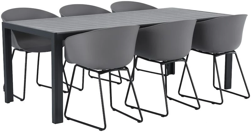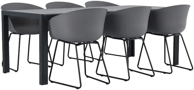 Moderni ja helppohoitoinen puutarharuokailuryhmä kuudelle. Pöytä valmistettu huoltovapaasta alumiinista sekä aintwood puukomposiitista. Seattle tuoleissa on tukeva teräsrunko, joka on maalattu säänkestävällä maalilla. Tuolin istuin osa on helposti pyyhdittävää sileää muovia. Tuolin painoraja on 120 kg.