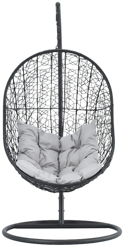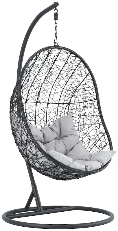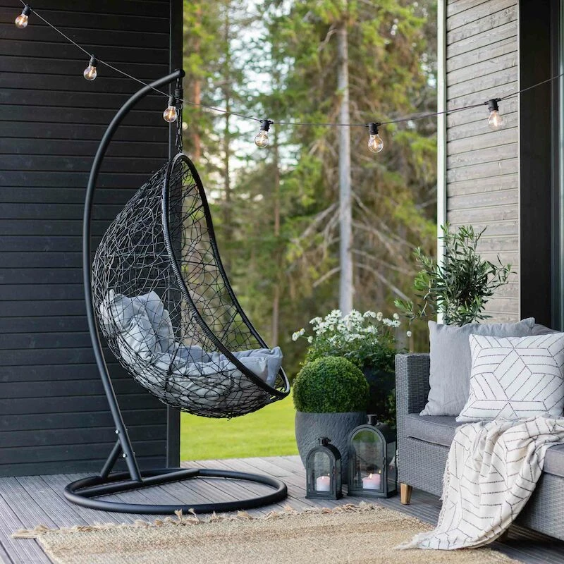 Skagen riippukeinu on valmistettu helppohoitesesta polyrottingista ja teräksisestä jalaksesta. Riippukeinu roikkuu tukevassa jalaksessa kettingin ja jousen varasssa. Jousi pehmentää ja mukavoittaa keinumista. Kuvan muhkea kosteutta hylkivä pehmuste kuuluu mukaan Skagen riippukeinuun.