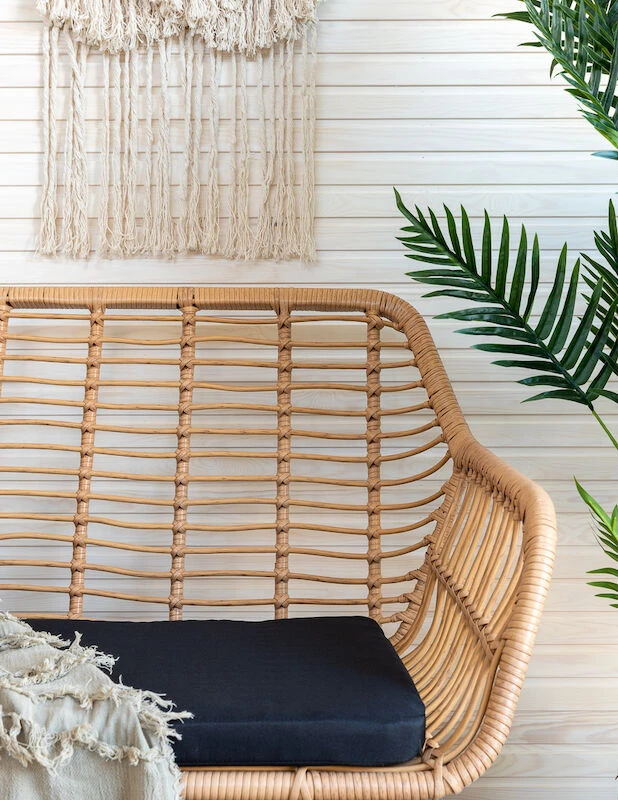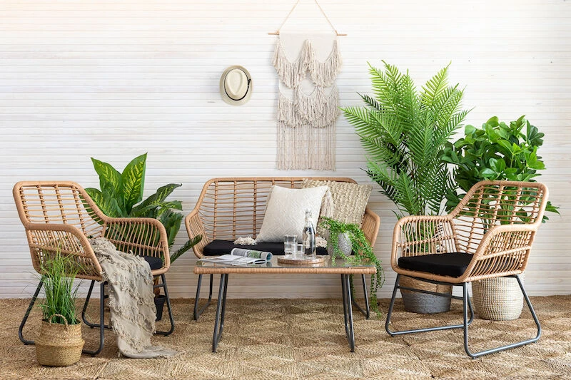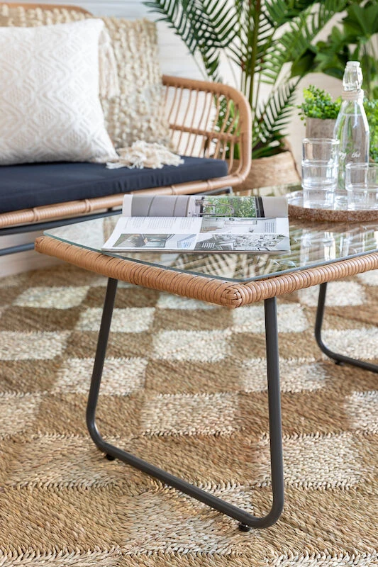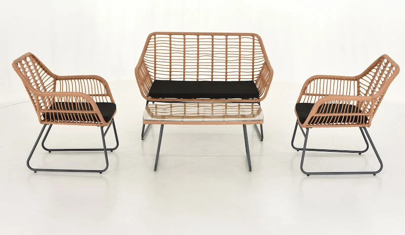 Kepeän kesäinen sohvaryhmä joka koostuu sohvasta, kahdesta tuolista ja lasipintaisesta pöydästä. Materiaali on UV-suojattua polyrottinkia, tukeva runko mustaksi maalattua metallia. Polyester-kankaalla verhoillut pehmusteet sisältyvät toimitukseen.