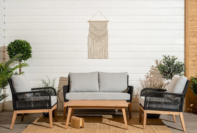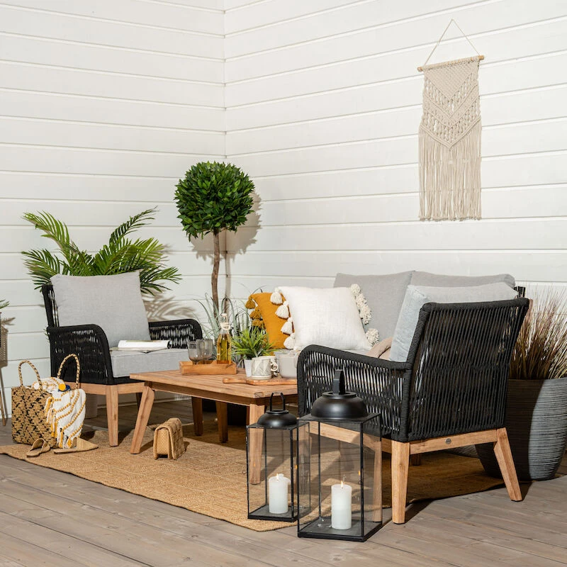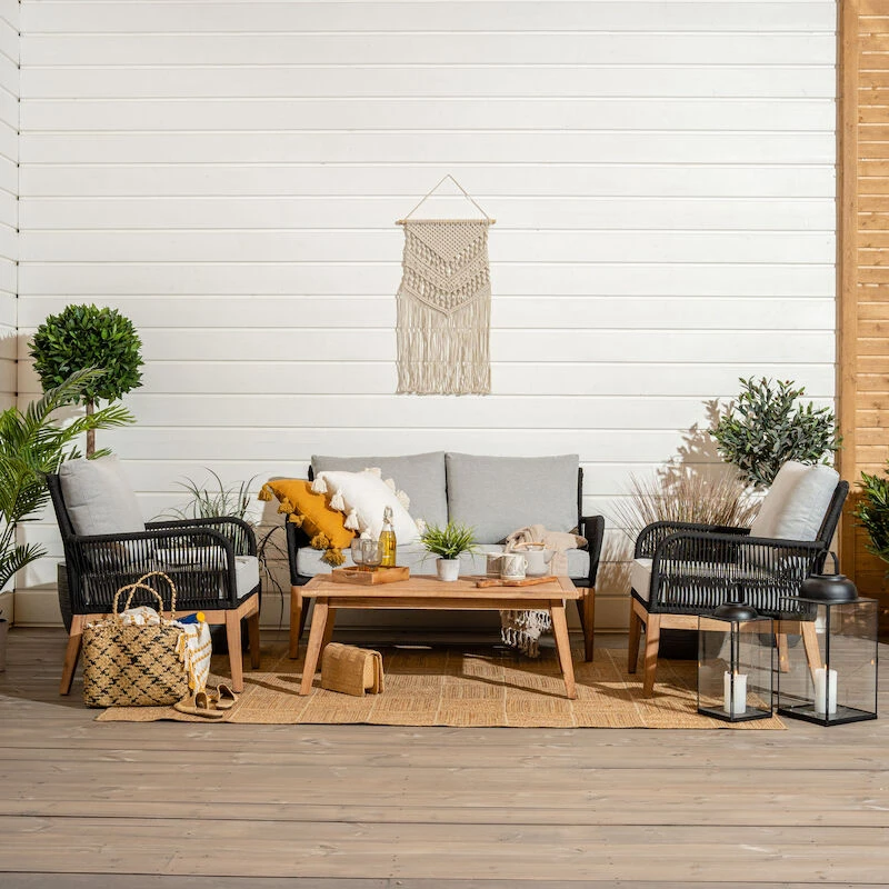Sohvan ja pöydän runko on köyttä ja galvanoitua terästä, jalat ovat akaasiapuuta. Tyynynpäälliset ovat 100% polyesteriä ja ovat pestävissä. Tuolin kantavuus on 120kg, sohvan 120+120kg ja pöydän 56kg.
